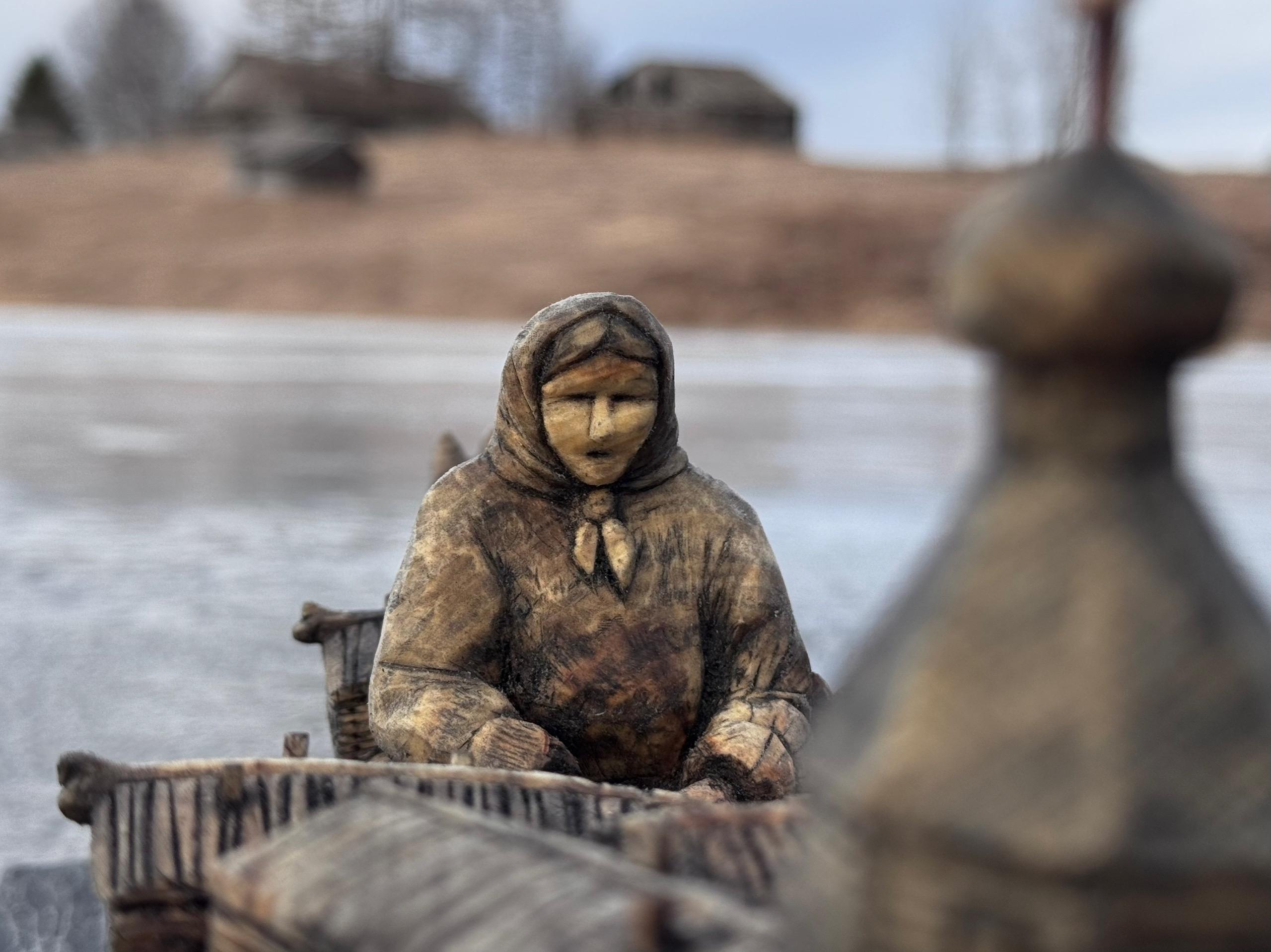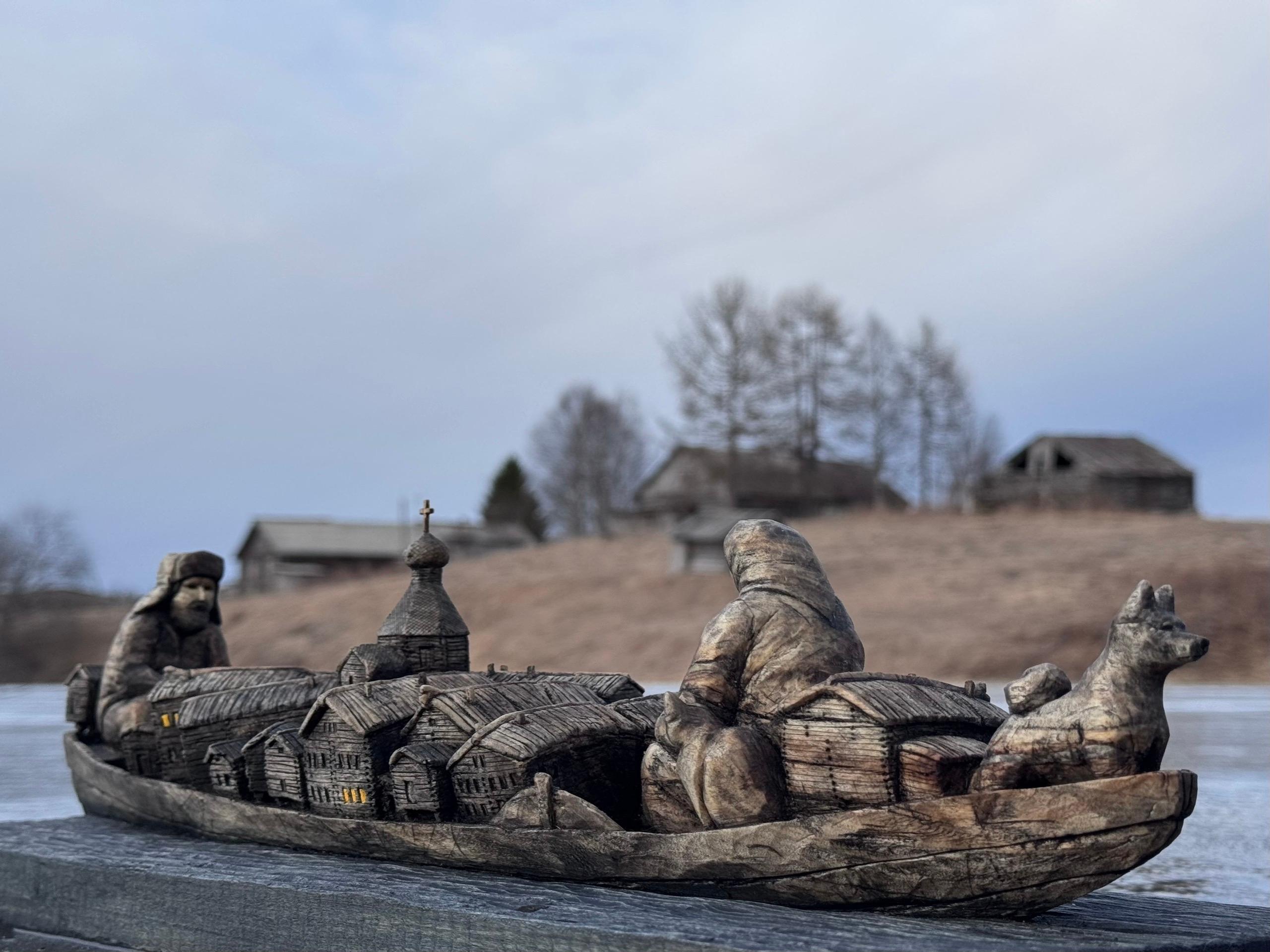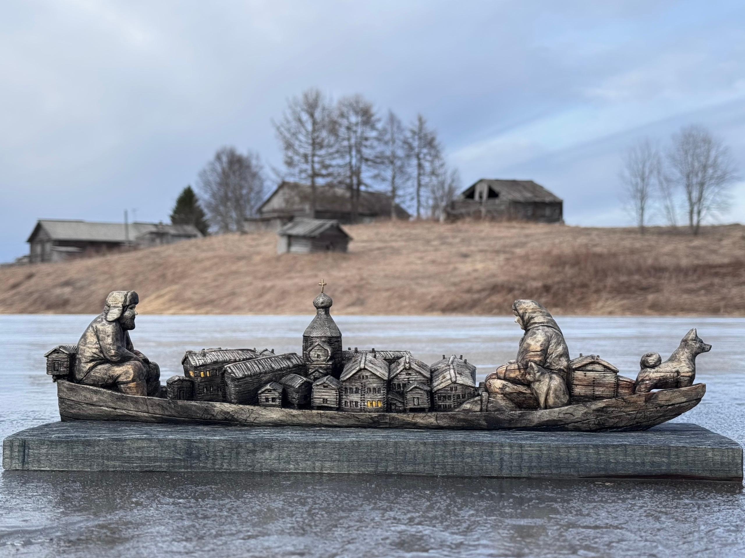 Деревянная скульптура под названием «Половодье» создана Алёной Вальковой под впечатлением от масштабного разлива рек в Архангельской области в 2020 году, когда многие населенные пункты оказались затоплены.