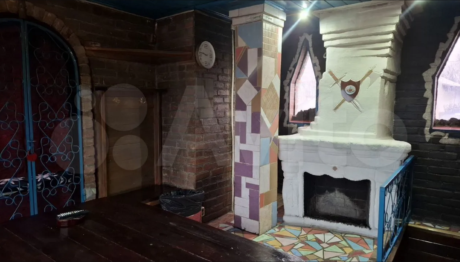 Двухэтажное строение в готическом стиле содержит баню и сауну. На прилегающей территории расположено помещение, предназначенное для автомойки. Согласно объявлению, часть объектов уже функционирует как коммерческое предприятие и обеспечивает регулярную прибыль.