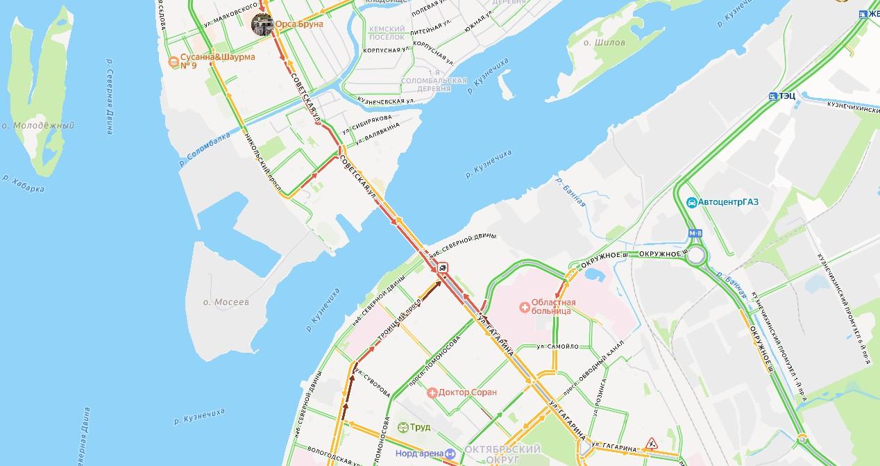 На Кузнечевском мосту в Архангельске произошло дорожно-транспортное происшествие, вызвавшее пробку. Движение автомобилей затруднено в обоих направлениях — в сторону района Соломбала и в сторону центра города.